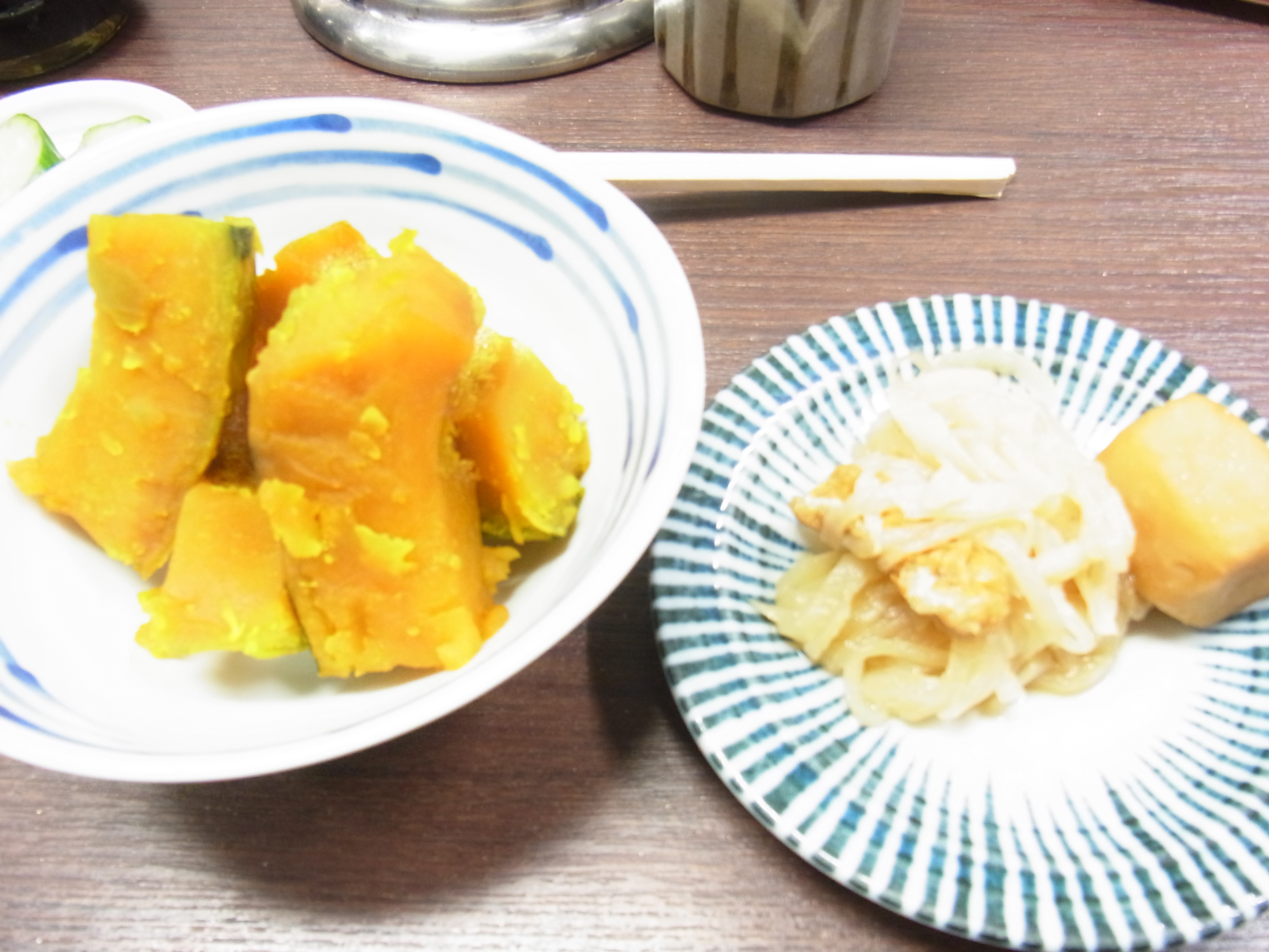 まずはカボチャの煮込みと小鉢。